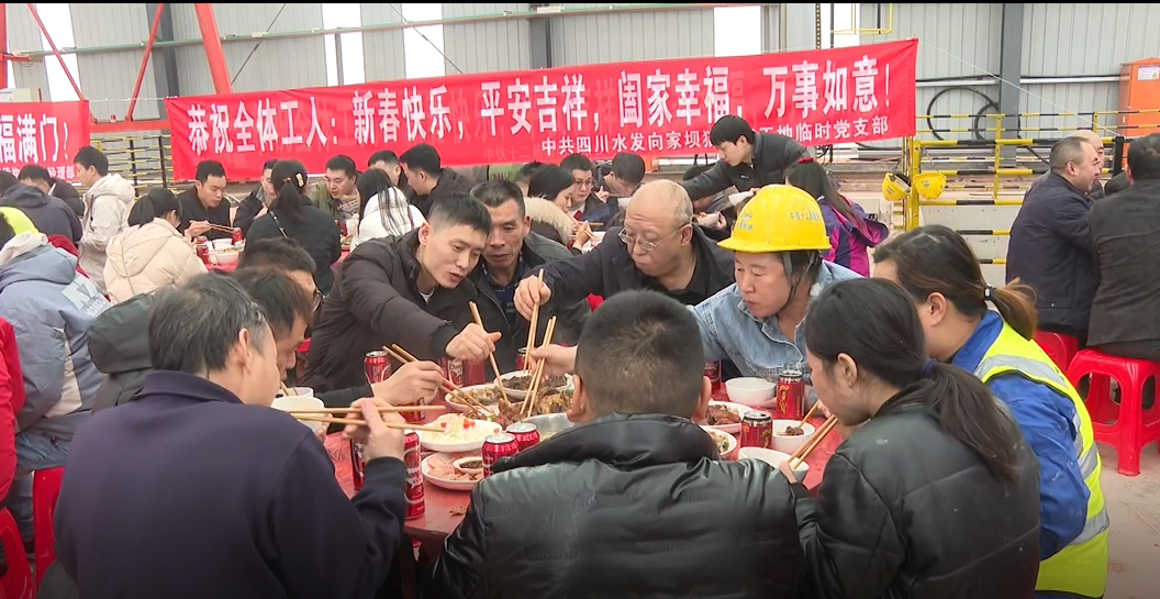 向家壩灌區(qū)北總干渠一期一步貓兒沱江底隧洞的施工現(xiàn)場,機器轟鳴,運輸車輛往來穿梭,現(xiàn)場一片忙碌景象。貓兒沱江底隧洞作為一期工程的控制性重難點工程,百余名建設(shè)者春節(jié)期間堅守工作崗位,只為順利穿越岷江江底,確保按期貫通。1月31日,正值大年三十,為了讓建設(shè)者們過上一個舒心的新年,項目部特意為來自五湖四海的建設(shè)者們準(zhǔn)備了一場充滿濃濃年味的壩壩宴,糖醋鯉魚、梅菜扣肉、紅燒雞……一盤盤具有年味兒的菜肴依次上桌,工地上的團年飯就此展開,大家一起吃團年飯,迎接虎年的到來。